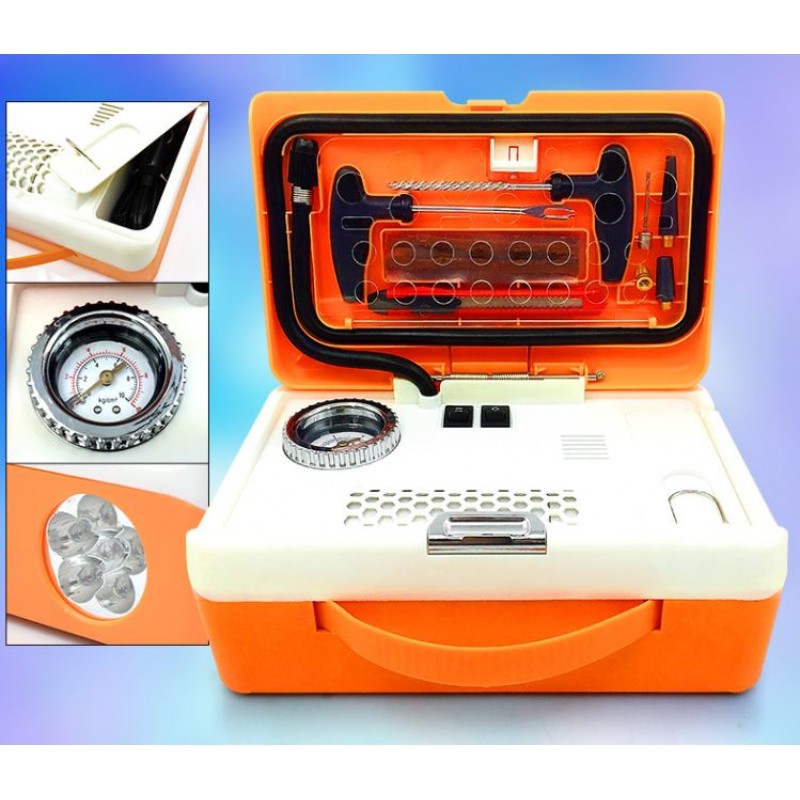 Φτιάξτε το λάστιχο του αυτοκινήτου σας ή της μηχανής σας επιτόπου, γρήγορα και αποτελεσματικά με αυτό το πλήρες σετ επιδιόρθωσης ελαστικών με ενσωματωμένο compressor ισχυρής παροχής 25Lt/m.