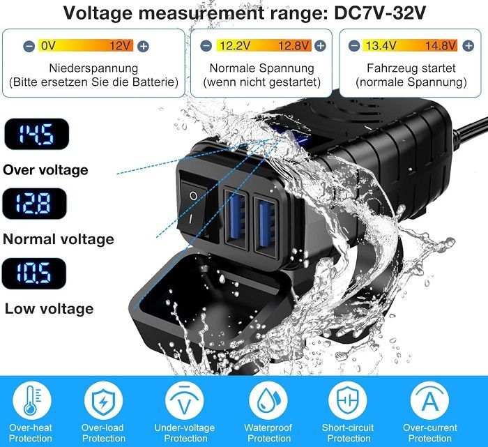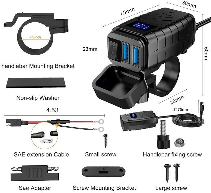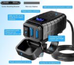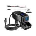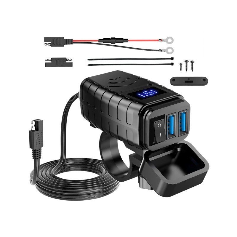 Αντάπτορας φόρτισης μοτοσυκλέτας με ψηφιακή οθόνη, 2 θύρες USB και εργονομικό σχεδιασμό τοποθέτησης στο τιμόνι.