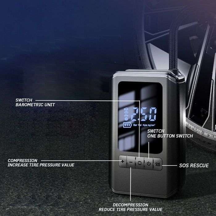 Ασύρματο επαναφορτιζόμενο κομπρεσέρ αέρος οχημάτων με ψηφιακή οθόνη LCD, σε ιδιαίτερα πρακτικό μέγεθος για να μπορείτε να το έχετε πάντοτε στο αυτοκίνητό σας χωρίς να πιάνει χώρο.