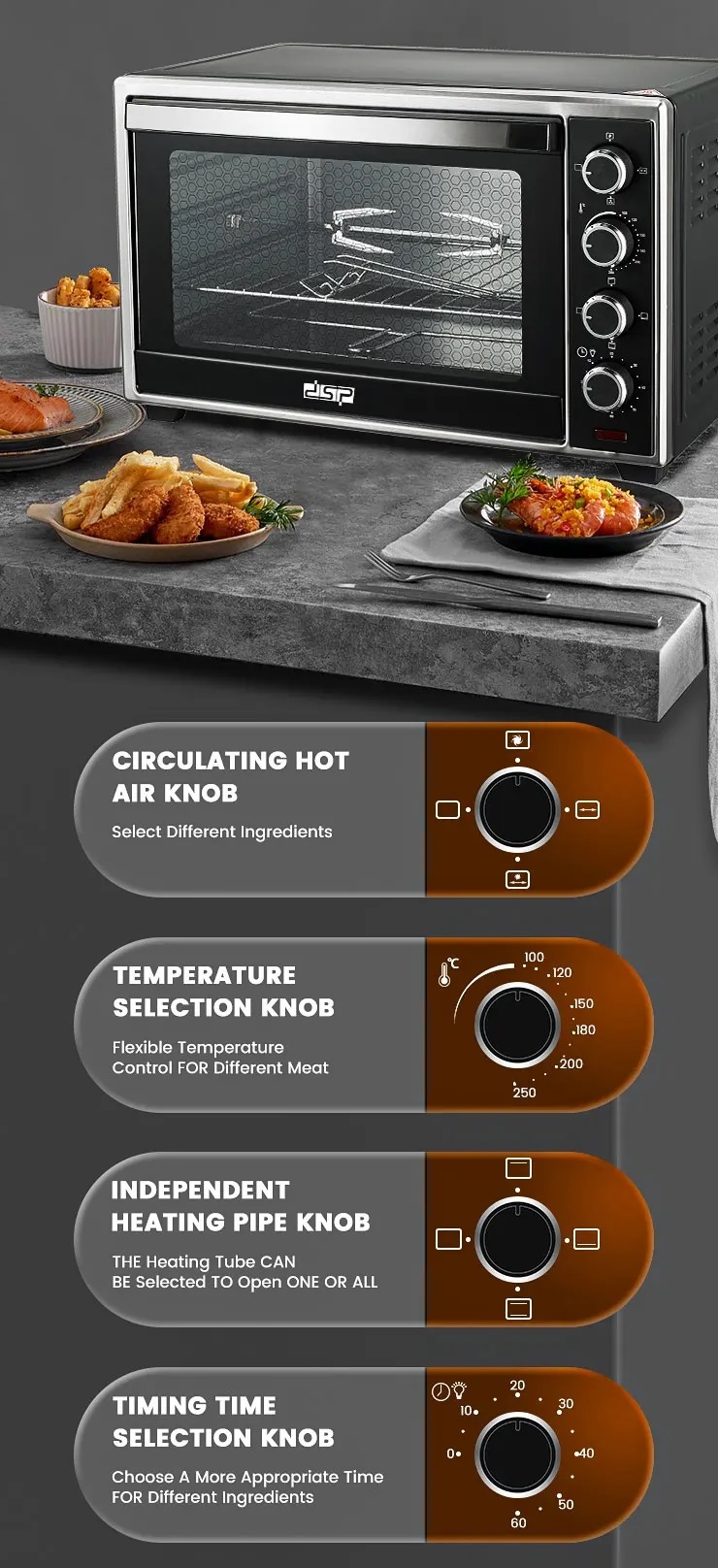 Ηλεκτρικό οικιακό φουρνάκι πολλαπλών χρήσεων της DSP, πρακτικού μεγέθους για τοποθέτηση πάνω στον πάγκο της κουζίνας σας, ιδανικό για χώρους όπου η τοποθέτηση μεγάλου φούρνου καθιστάται δύσκολη. Υψηλής ποιότητας και ισχύος, με πολλά αξεσουάρ: μεγάλο ταψί, ταψί στρογγυλό πίτσας, σχάρα και περιστρεφόμενη σούβλα.