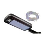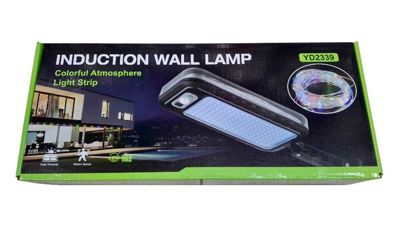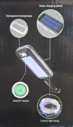 Ηλιακός προβολέας LED λευκού φωτισμού με αισθητήρα κίνησης που τον ενεργοποιεί αυτόματα και με ενσωματωμένη ταινία/γιρλάντα με πολύχρωμο διακοσμητικό φωτισμό LED RGB.