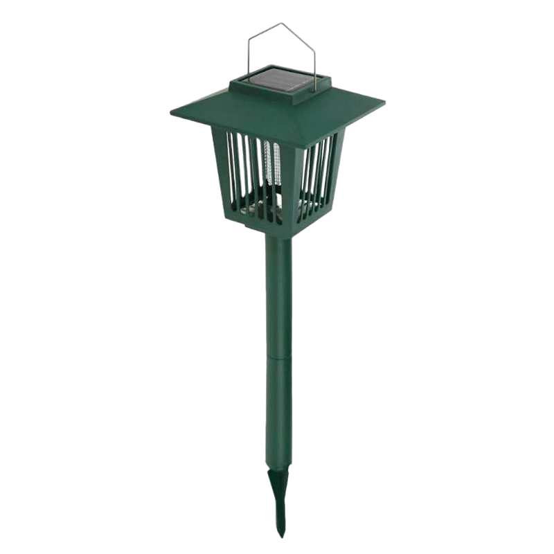 Ηλιακό φωτιστικό κήπου LED με εντομοκτόνο και πάσσαλο τοποθέτησης στο έδαφος. Τροφοδοτείται αποκλειστικά από το ηλιακό πάνελ και εγκαθιστάται ασύρματα χωρίς καλώδιο, ιδανικό για απόλυτα οικονομικό, διακοσμητικό φωτισμό κήπου-βεράντας κτλ. Παράλληλα έλκει τα ενοχλητικά έντομα με το φως του και τα εξουδετερώνει μόλις αυτά ακουμπήσουν στην ειδική αντίσταση της λάμπας. Ο πάσσαλος είναι αφαιρούμενος και μπορεί να τοποθετηθεί και ως φαναράκι οπουδήποτε επιθυμείτε. Υλικό: ABS+PVC, Στεγανότητα: IP65, Ηλιακό πάνελ: 2V 100mA, Χρόνος φόρτισης: 6-8 ώρες σε ηλιοφάνεια, Χρόνος φωτισμού: έως 8 ώρες, Ενσωματωμένη επαναφορτιζόμενη μπαταρία NiMH, Πλήκτρο on/off. Διαθέτει αισθητήρα φωτός για αυτόματη ενεργοποίηση όταν σκοτεινιάσει. Διαστάσεις: 13.5 x 15cm + 50cm πάσσαλος