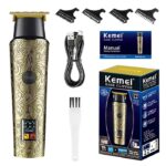 Eπαναφορτιζόμενη κουρευτική μηχανή της Kemei, με λεπίδα ακριβείας από ανοξείδωτο ατσάλι και εντυπωσιακό μεταλλικό design με ανάγλυφα σχέδια. Κατάλληλη για κάθε είδους περιποίηση σε μαλλιά, γένια και σώμα.
