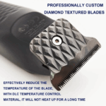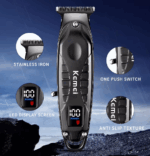 Χαρακτηριστικά: Ισχύς: 5W, Ρυθμιζόμενη λεπίδα 0-1mm, Ταχύτητα 6500RPM, Ψηφιακή οθόνη LED, Επαναφορτιζόμενη μπαταρία λιθίου 1200mah, Χρόνος φόρτισης: 2 ώρες, Χρόνος λειτουργίας: 120 λεπτά, 4 χτενάκια για διαφορετικά μήκη κοπής, Λεπίδα από ανοξείδωτο ατσάλι πλάτους 40mm, Διαστάσεις: 15.5 x 4.5 cm.