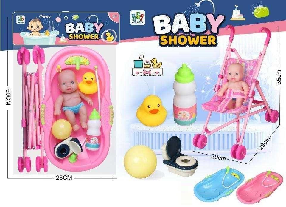 Σετ κούκλα με καροτσάκι βόλτας και πλήρες σετ μπάνιου με μπανιέρα και παιχνίδια, σε πανέμορφο πολύχρωμο σχεδιασμό με πολλαπλές δυνατότητες και με ανθεκτική κατασκευή για ατελείωτο παιχνίδι!