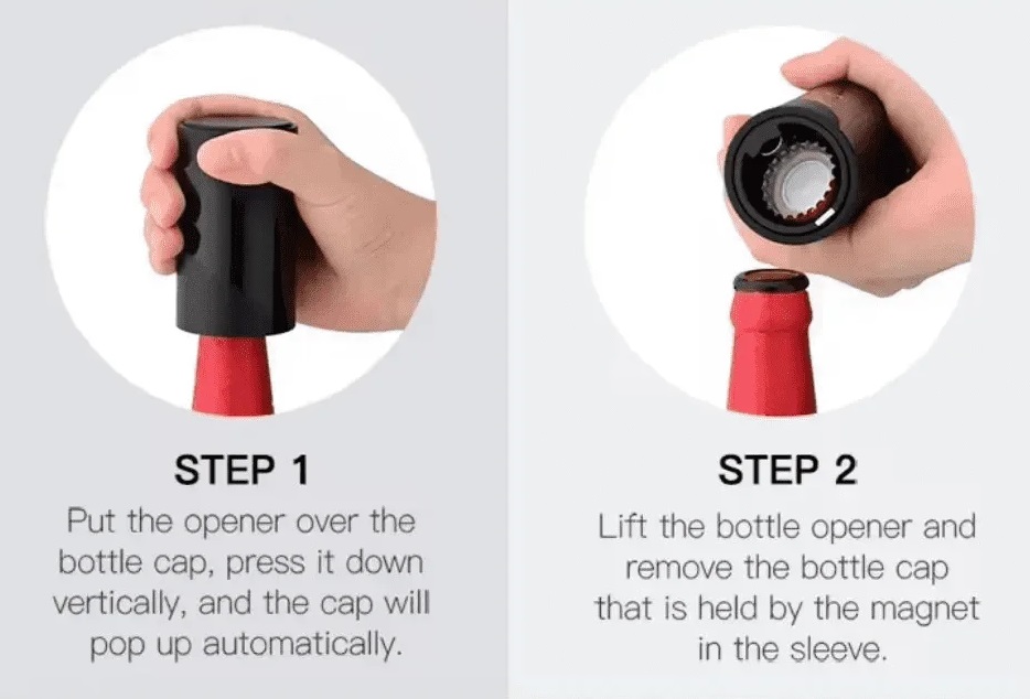 Aυτόματο ανοιχτήρι μπουκαλιών με μαγνήτη, για πανεύκολο άνοιγμα των μπουκαλιών μπύρας και αναψυκτικών με μία κίνηση: απλά τοποθετήστε το εργαλείο επάνω στο καπάκι μέχρι να κουμπώσει και τραβήξτε. Το καπάκι αφαιρείται και παραμένει μέσα χάρη στον ειδικό μαγνήτη, από όπου μπορείτε να το αφαιρέσετε χωρίς να πέσει και χωρίς να στραβώσει, ώστε να μπορείτε να το επαναχρησιμοποιήσετε.