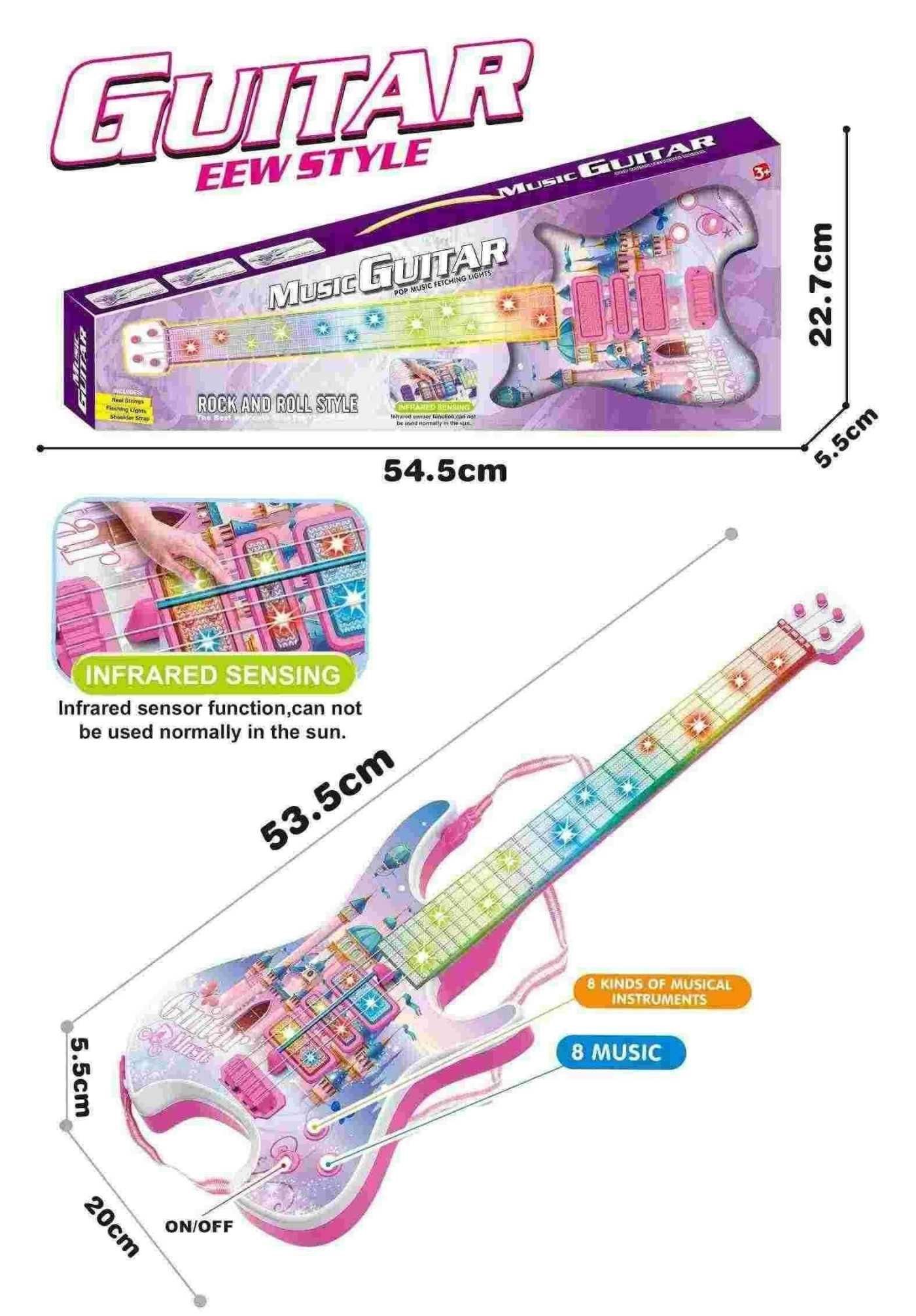 Παιδική ηλεκτρονική κιθάρα σε πανέμορφο πολύχρωμο σχεδιασμό, με φωτισμό και δυνατό ήχο, για να γίνεις μία αληθινή Ροκ Σταρ! Διαθέτει ρυθμιζόμενο λουράκι ώμου.