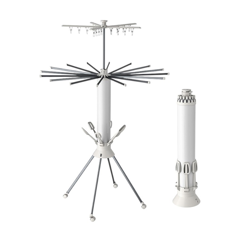 Πτυσσόμενη κρεμάστρα δαπέδου και απλώστρα ρούχων πολλαπλών χρήσεων, με μεταλλικό σκελετό, βάσεις παπουτσιών, κλιπς/μανταλάκια μικρών ρούχων και ροδάκια μετακίνησης.