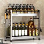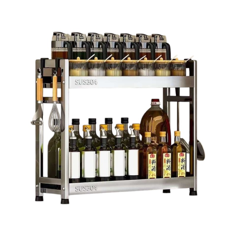 Μεταλλική ραφιέρα οργάνωσης πάγκου κουζίνας ανοξείδωτη, με 2 ράφια κατάλληλα για τρόφιμα και δοχεία και με πρακτικά κρεμαστράκια για αξεσουάρ.