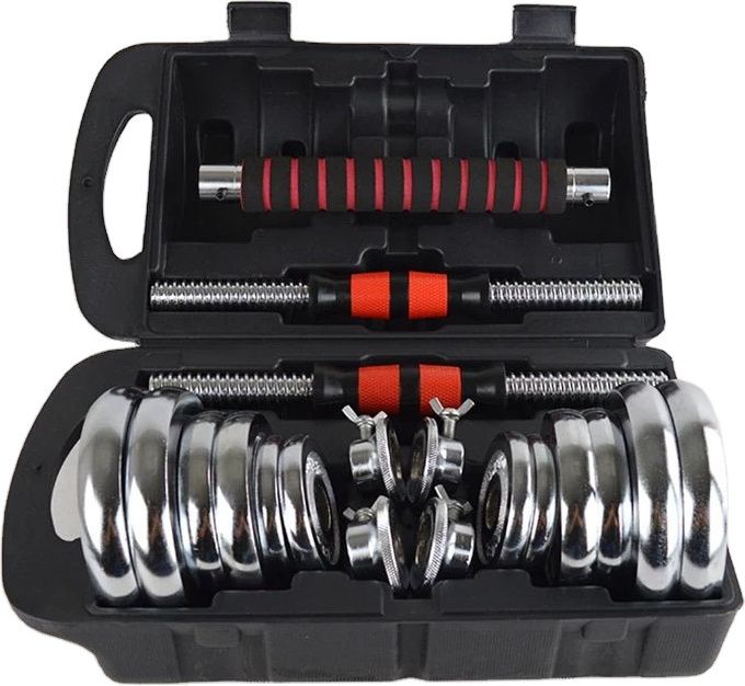 Πλήρες σετ αλτήρων σε βαλιτσάκι, μέγιστου βάρους 20 kg, με επιπρόσθετο τμήμα που βιδώνει στους αλτήρες και μετατρέπεται πολύ εύκολα σε μπάρα. Πολυλειτουργικό, σας παρέχει τη δυνατότητα μεγάλης ποικιλίας ασκήσεων, κυρίως του άνω κορμού, χεριών, στήθους και πλάτης, ιδανικό για αρχάριους και προχωρημένους. Το σετ περιλαμβάνει:
