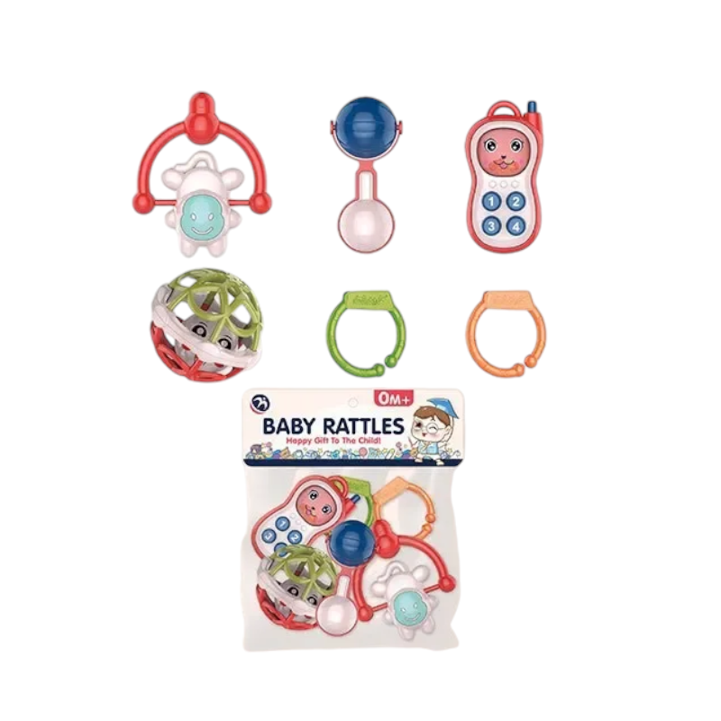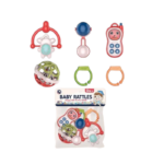 Βρεφικές κουδουνίστρες και μασητικά από ασφαλή μη τοξικά υλικά, σε υπέροχα σχέδια και χρώματα, με χειρολαβές για εύκολη χρήση. Το σετ περιλαμβάνει 6 τεμάχια.