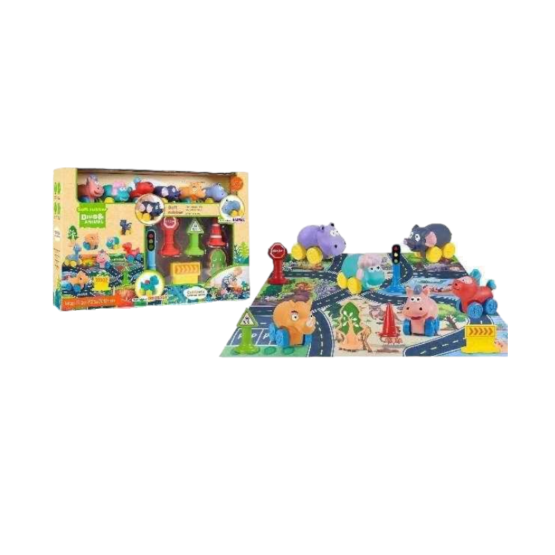 Σετ μοκέτα-αυτοκινητόδρομος με αμαξάκια-ζωάκια από μαλακή μη τοξική σιλικόνη για μέγιστη ανθεκτικότητα και ασφαλές παιχνίδι.