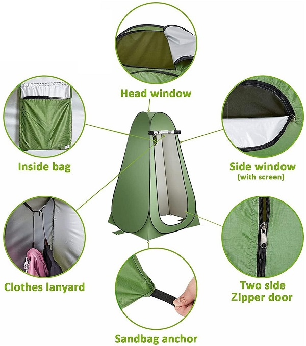 Σκηνή camping αποδυτήριο-ντουζ με ανθεκτικό σκελετό, πολύ εύκολη στο στήσιμο. Πανί από 100% αδιάβροχο πολυεστερικό ύφασμα και αδιάβροχη βάση. Διαθέτει αεριζόμενη οροφή, ιμάντα-κρεμάστρα στο εσωτερικό και πορτάκι με φερμουάρ.
