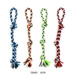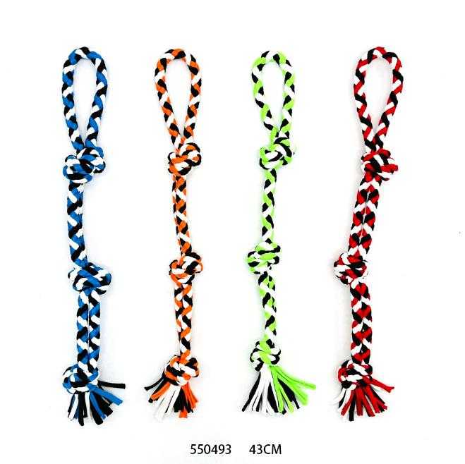 Παιχνίδι σκύλου σχοινί με κόμπους, από ανθεκτικό, μη τοξικό πολυεστέρα, ιδανικό για παιχνίδια τραβήγματος/αντίστασης ενώ παράλληλα βοηθά στην υγιεινή στόματος του σκύλου σας καθώς καθαρίζει ήπια και απασχολεί τα δόντια του. Συνολικό μήκος: 43cm.