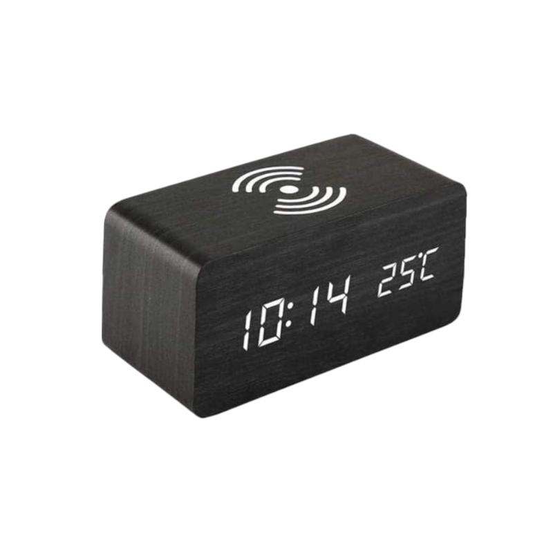 Ψηφιακό ρολόι–Ξυπνητήρι LED, με βάση ασύρματης φόρτισης smartphone, σε ιδιαίτερο σχεδιασμό με εφέ ξύλου.